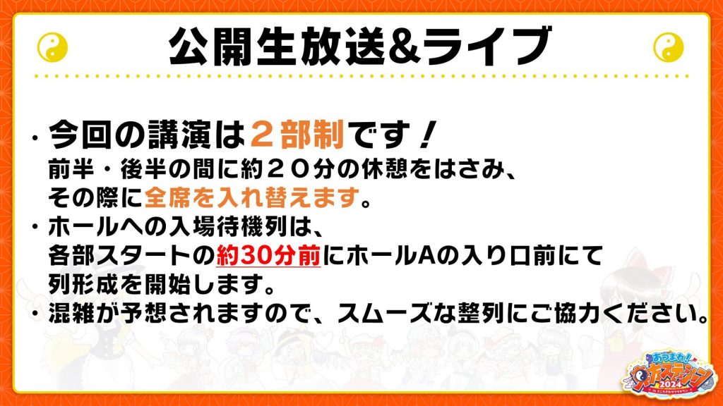 ・ホールへの入場待機列は、前半・後半スタートの約30分前にホールAの入り口前にて列形成を開始します。その時間までに、ホールA入口前に集合してください。混雑状況によっては上記の時間よりも早く列形成を行うこともございます。あらかじめご了承下さい。