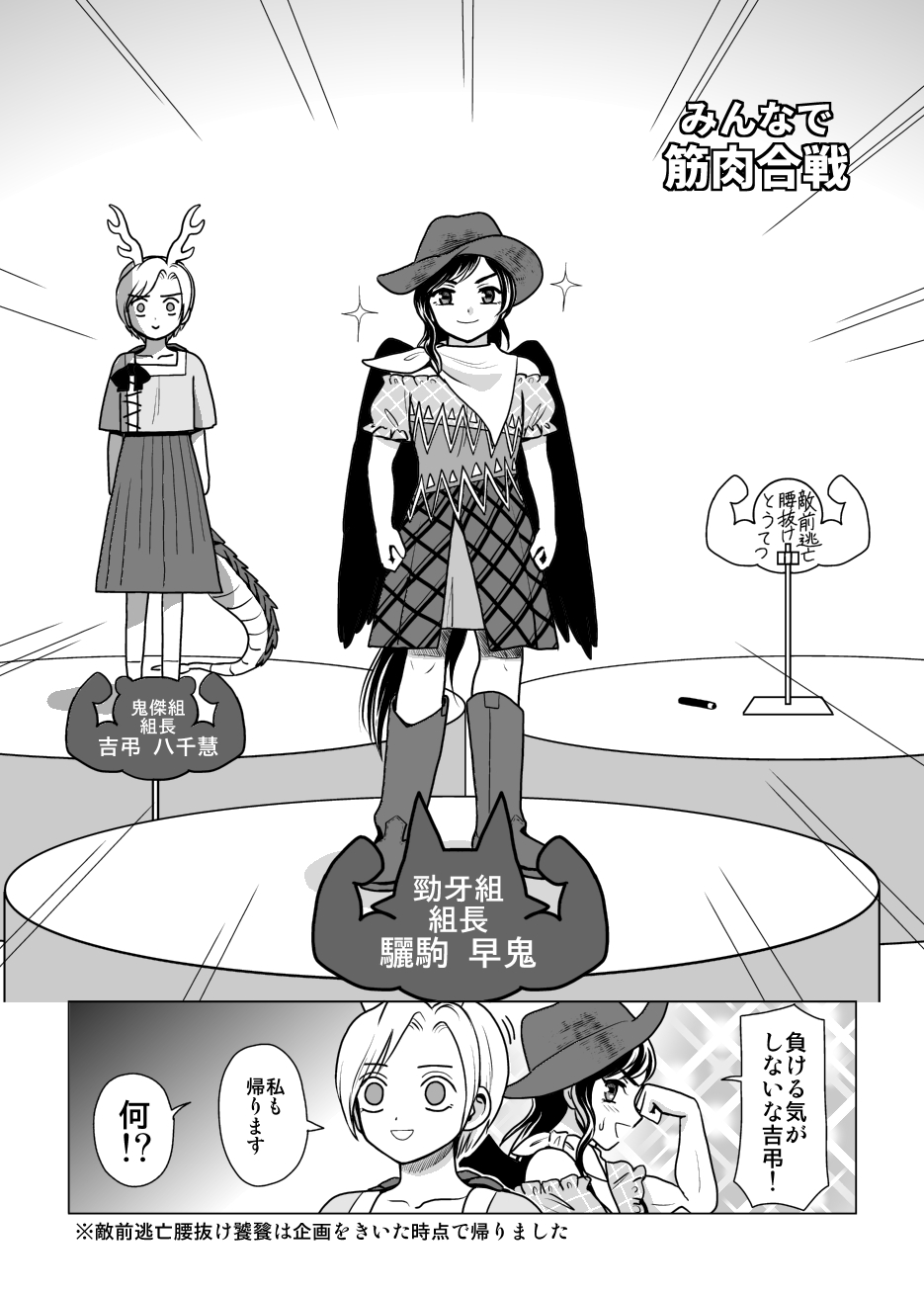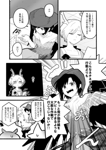 驪駒と吉弔中心の小ネタギャグ本です。二人が〇〇しないと出られない部屋に閉じ込められたり、百合同人誌作られたり、みんなで筋肉合戦がはじまったりします。おおむね吉弔が驪駒に振り回されてます。