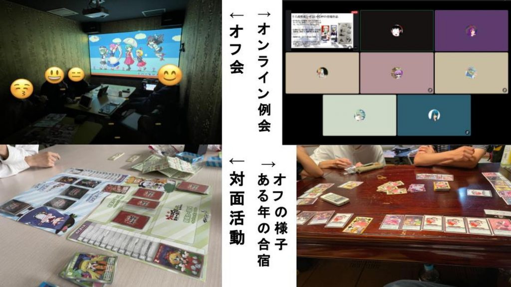 基本的には対面で原作プレイや2次創作のゲーム、雑談などをしています。また、定期的に聖地巡礼や即売会、学祭などのイベント参加も行っています。さらに、オンライン上(Discord)でも不定期に活動しています。