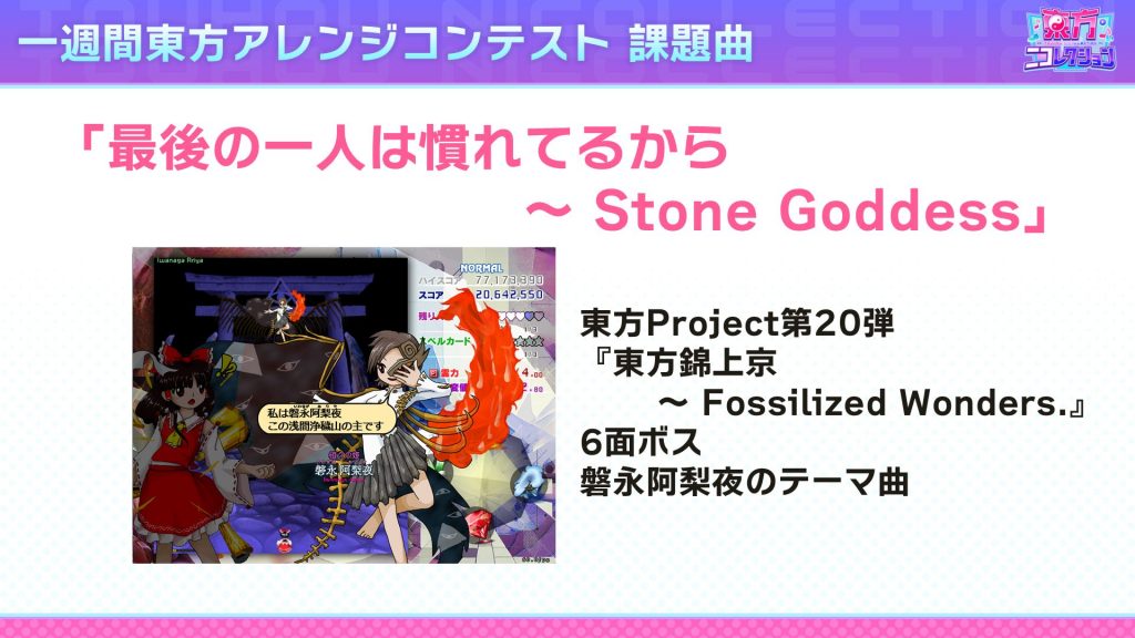 今回の課題曲は、最新作「東方錦上京」の6面ボス楽曲『最後の一人は慣れてるから ~ Stone Goddess』。最新のZUNサウンドアレンジに、一週間で立ち向かいましょう!