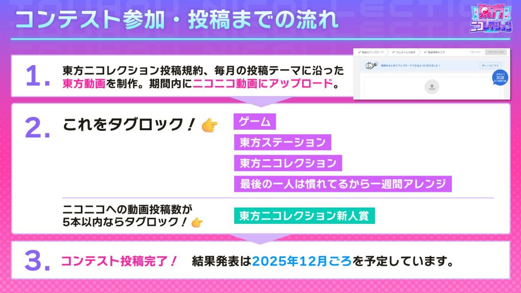 1,当ページ下記にあります投稿規約、各投稿テーマに沿った東方動画を制作し、投稿期間内にニコニコ動画にアップロードしてください。
