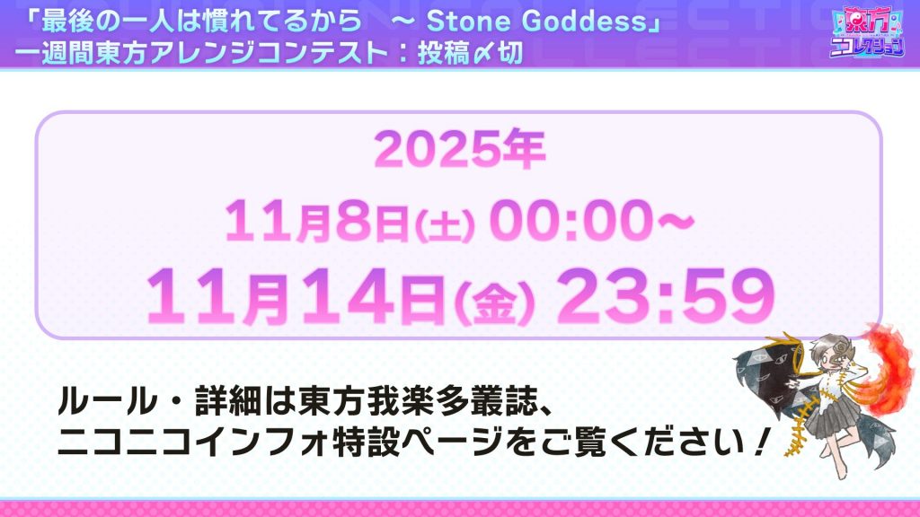 2025年11月のテーマは……一週間東方アレンジコンテスト!課題曲は『最後の一人は慣れてるから ~ Stone Goddess』です! 動画の投稿先はもちろんニコニコ動画です。