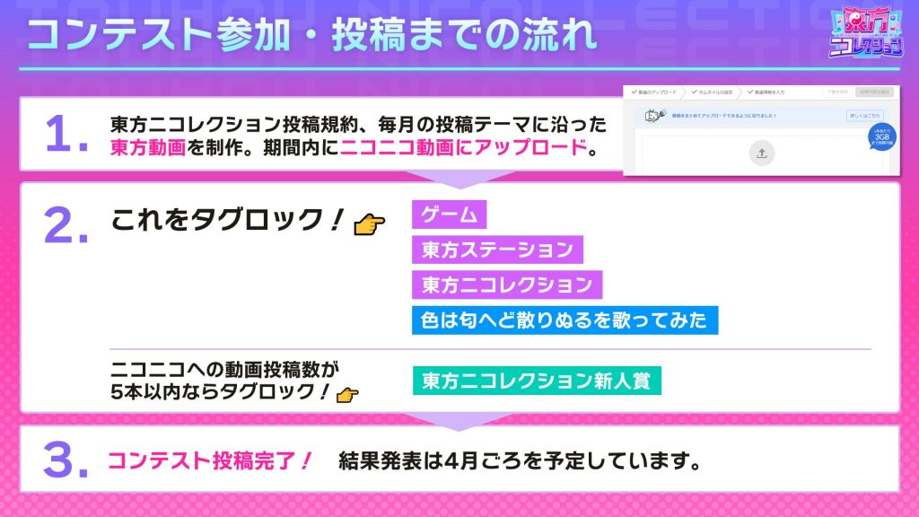 1,当ページ下記にあります投稿規約、各投稿テーマに沿った東方動画を制作し、投稿期間内にニコニコ動画にアップロードしてください。