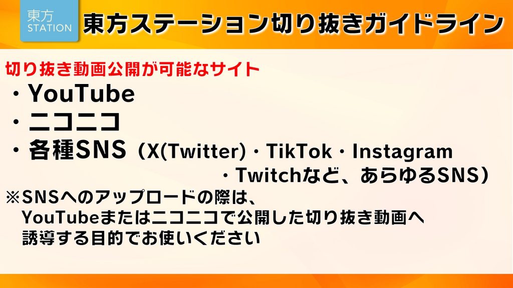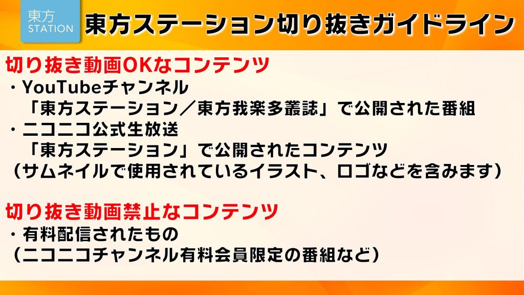 今後、東方ステーション生配信は、お知らせするガイドラインを守っていただければ、動画を切り抜いてYouTubeまたはニコニコへアップロードしてもOKです!