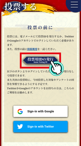 GoogleアカウントまたはX(Twitter)アカウントでログインする形でも、投票が可能です。ログインした場合は、投票用IDを発行する必要がありません。