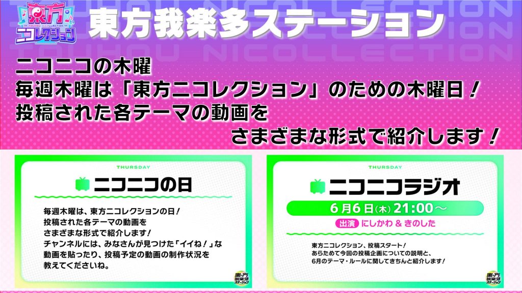 6月6日は初回の「ニコレクションの木曜ラジオ」を放送予定! 改めてコンテストのルールなどを紹介したり、過去行った「一週間アレンジコンテスト」の優秀楽曲をまとめて紹介いたします。
