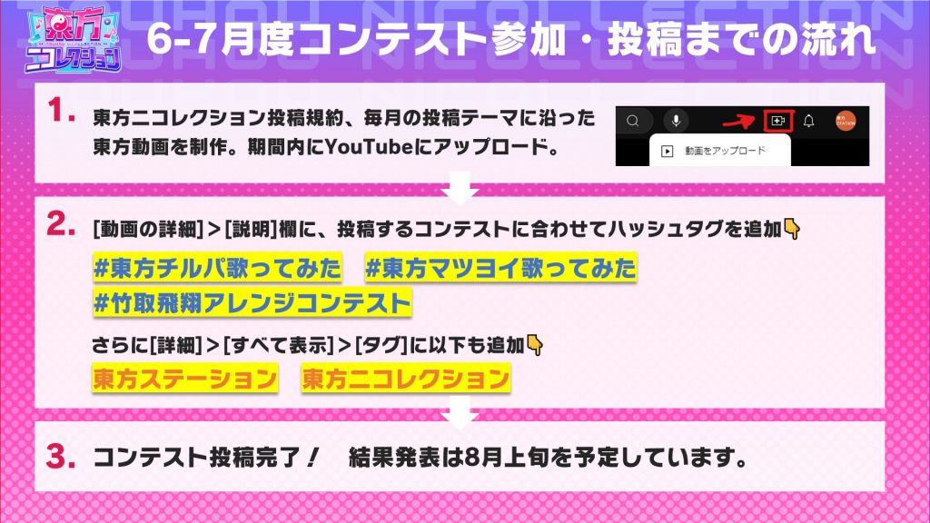 1,当ページ下記にあります投稿規約、各投稿テーマに沿った東方動画を制作し、投稿期間内にニコニコ動画にアップロードしてください