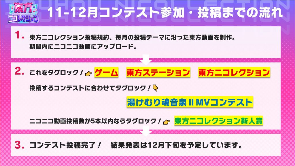「東方ニコレクション」とは、東方ステーションとニコニコによるコラボ動画投稿コンテスト。