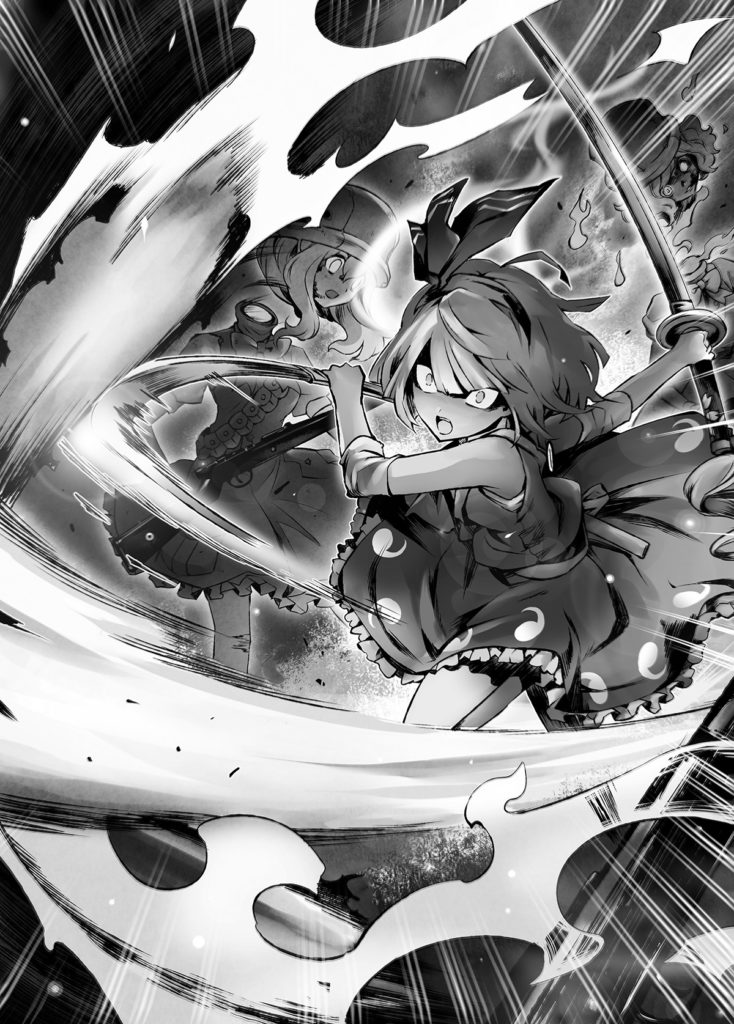 刀を元の位置に戻しながら妖夢は身体を反転。背後から迫っていた銃床の一撃をすり抜けるように回避しながら勢いを利用した斬撃で両腕を斬り飛ばす。