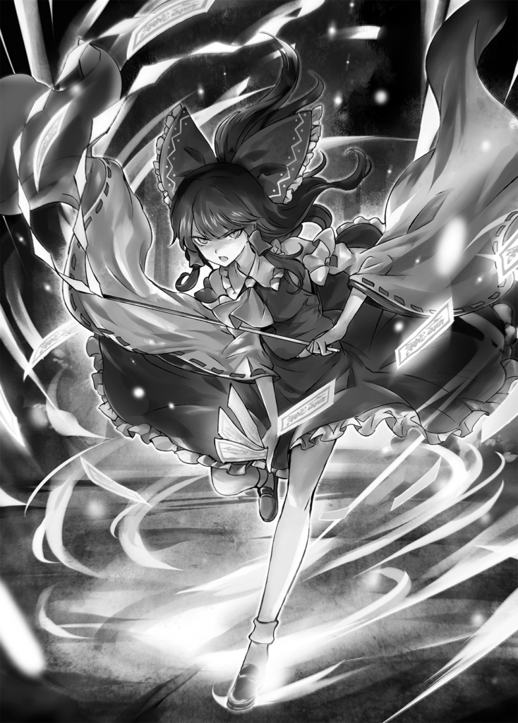 巫女服姿の少女の周りにはいくもの御札が彼女を中心として周回軌道を描いており、本人はご丁寧にお祓い棒まで持っていた。これでもかというほどの完全武装っぷりである。